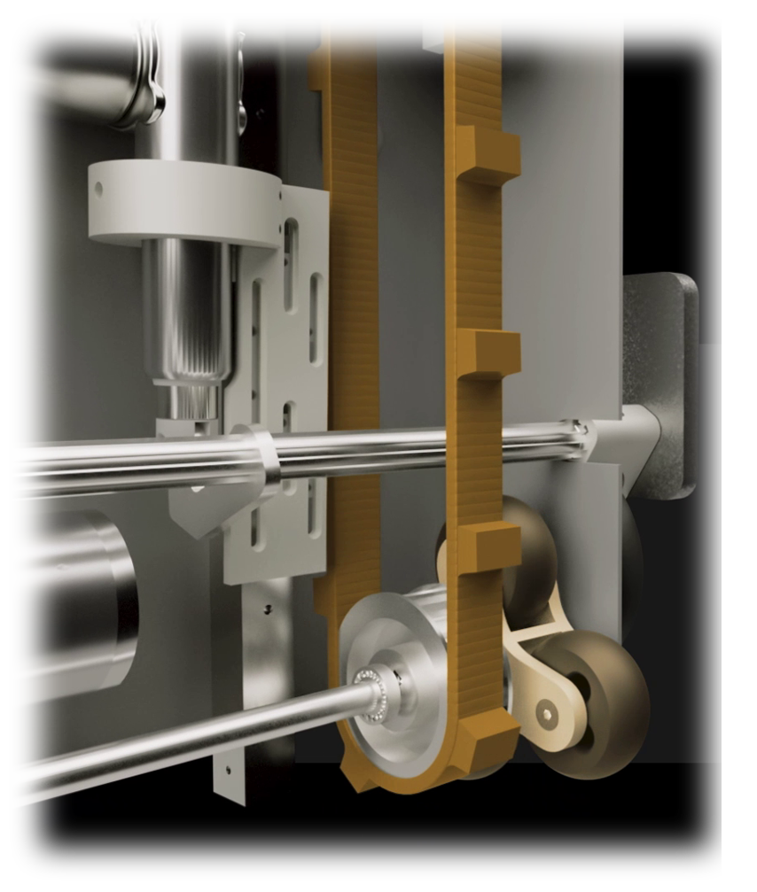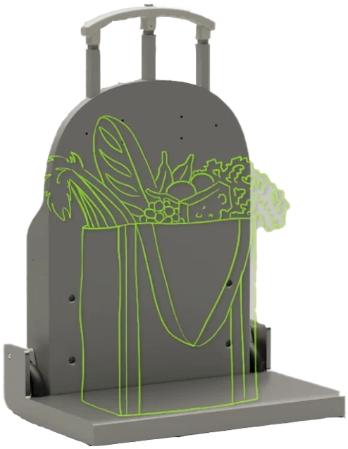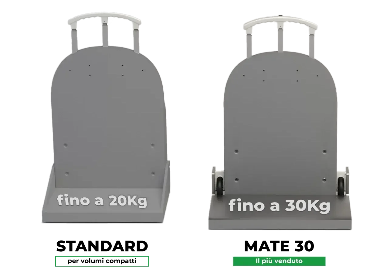 Il suo meccanismo brevettato combina un sistema di cingoli supportati da 3 ruote per il sollevamento su scale e due ruote maggiorate esterne per il trasporto sul piano.